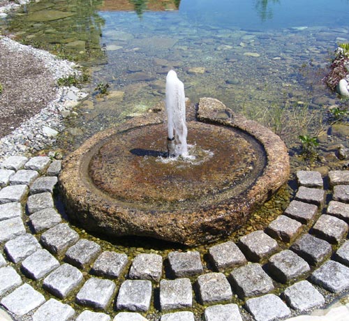 Für das Wasserspiel haben wir einen historischen Mühlstein verwendet.